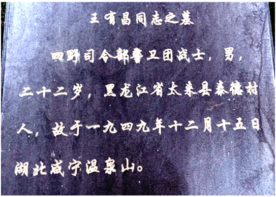 王鹏程介绍,小时候逢年过节家人团聚时,爷爷辈的老人经常提起老疙瘩(王有昌)去当兵的事,但是他从来没见到过五爷,后来几位爷爷都去世了,也很少有人提起五爷当兵的事了。电话里,王鹏程声音哽咽:“76年了,终于知道五爷葬在湖北咸宁温泉山,我们一定去祭拜他。”